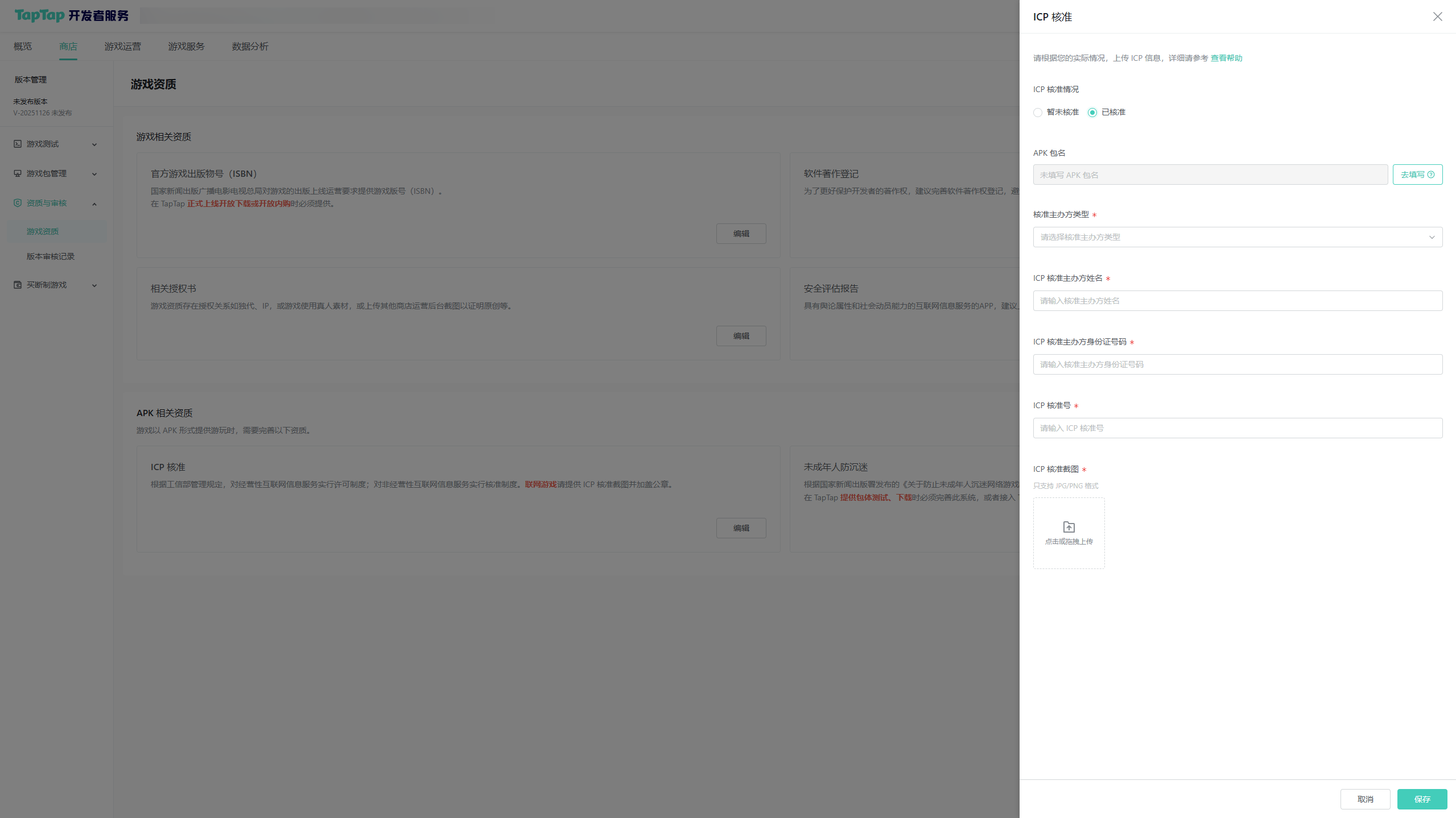 可在开发者中心 >> 商店 >> 游戏资质 >> ICP 核准中按要求提交相关证明后保存信息,然后点击右上角提交审核。