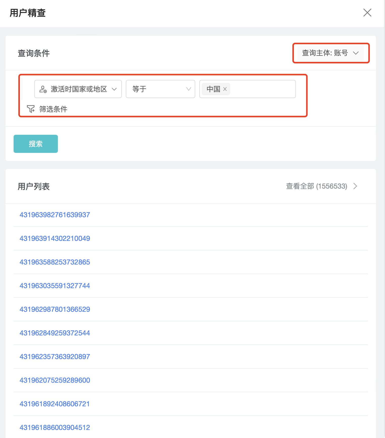 选择主体并设置查询条件,可以找出匹配的设备或账号,也可通过账号或设备 ID 进行精确搜索。