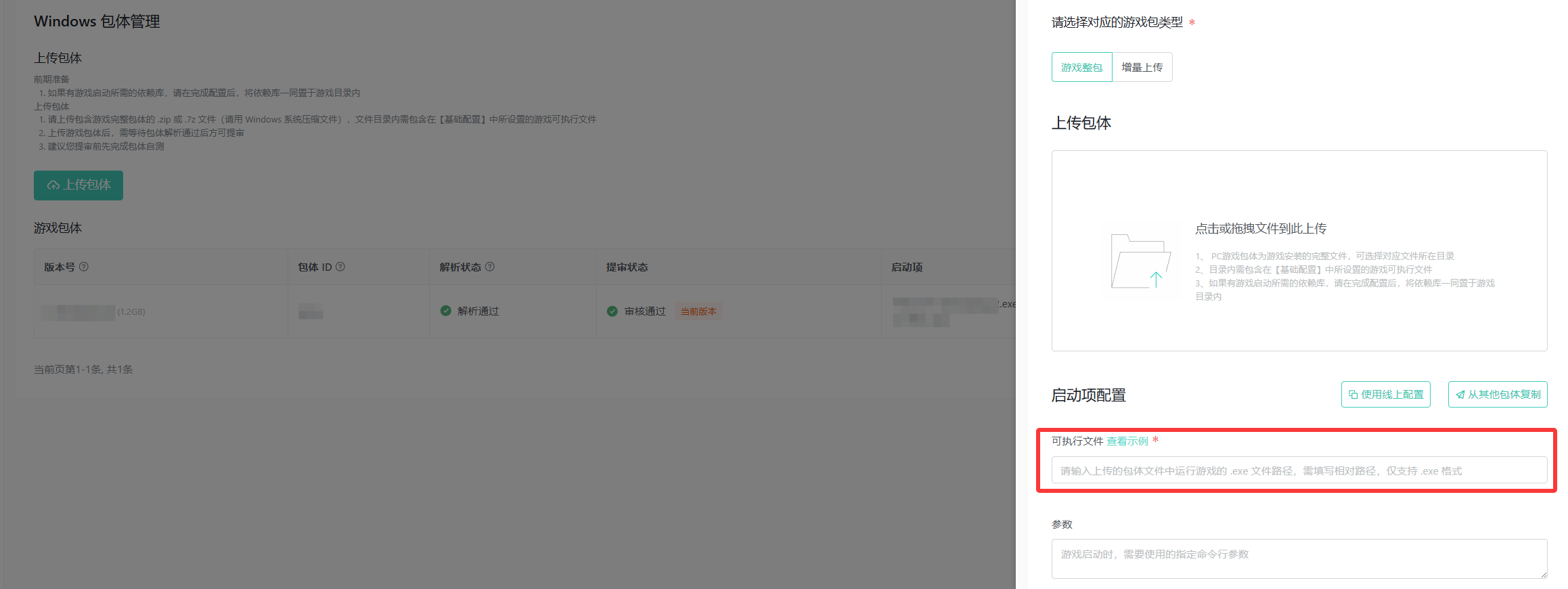 前往开发者中心 >> 商店 >> PC 包体管理 >> 包体管理,点击「上传包体」,选择包体文件,并填写启动项配置。