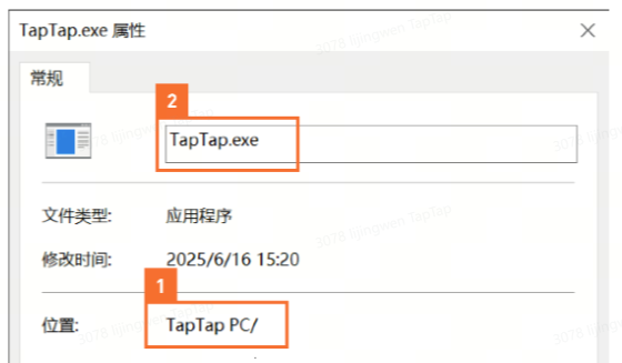 | 情况 1 | ![]() | 1. 当属性点开,【位置】显示为根目录/的情况,请把图中序号1和序号2展示的内容作拼接,即为:TapTap PC/TapTap.exe ![]() |