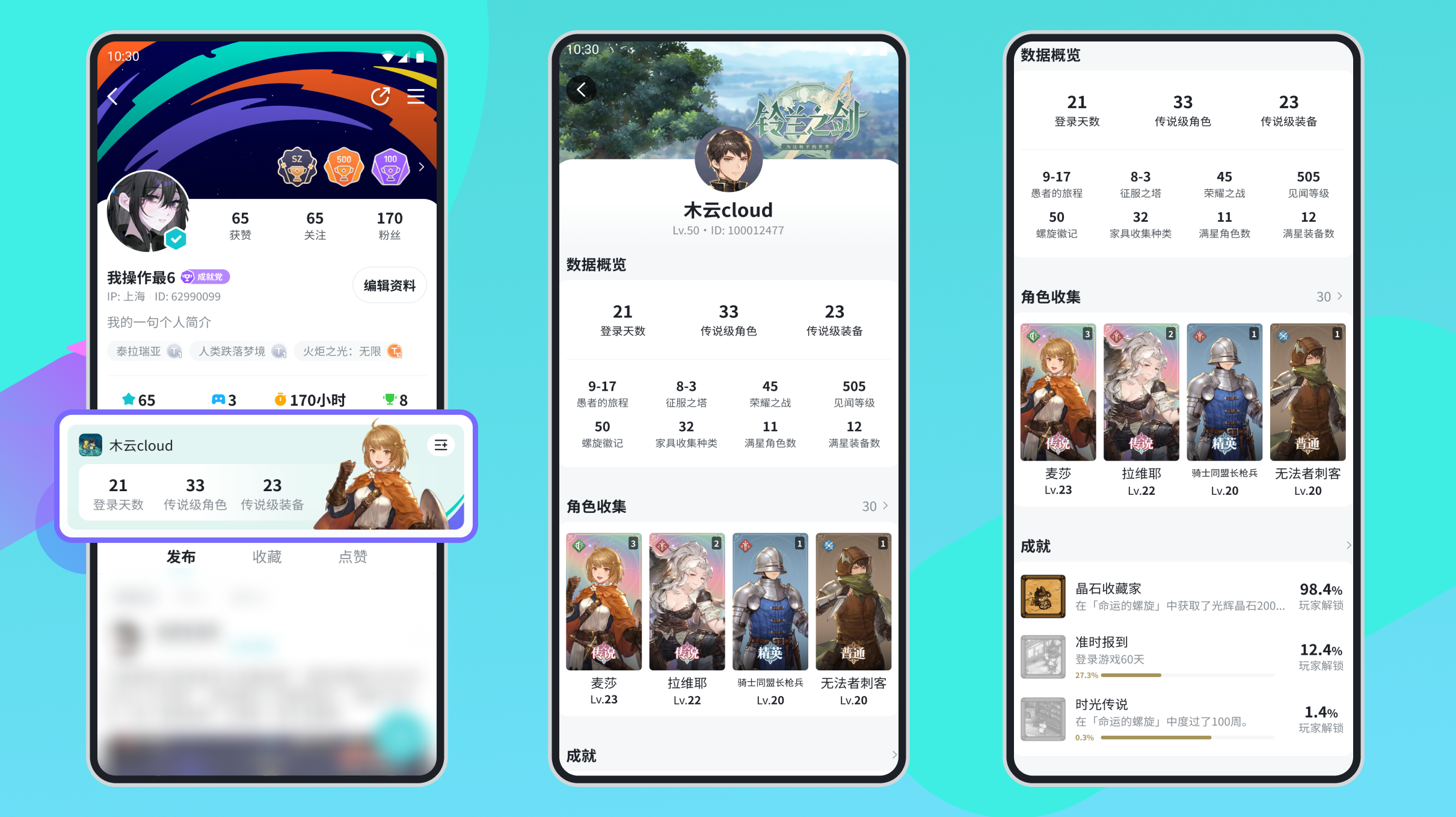 玩家可以在 TapTap 个人主页和游戏详情页查看战绩数据,展示形式包括角色信息、游戏成就、数据统计等多种可配置模块。