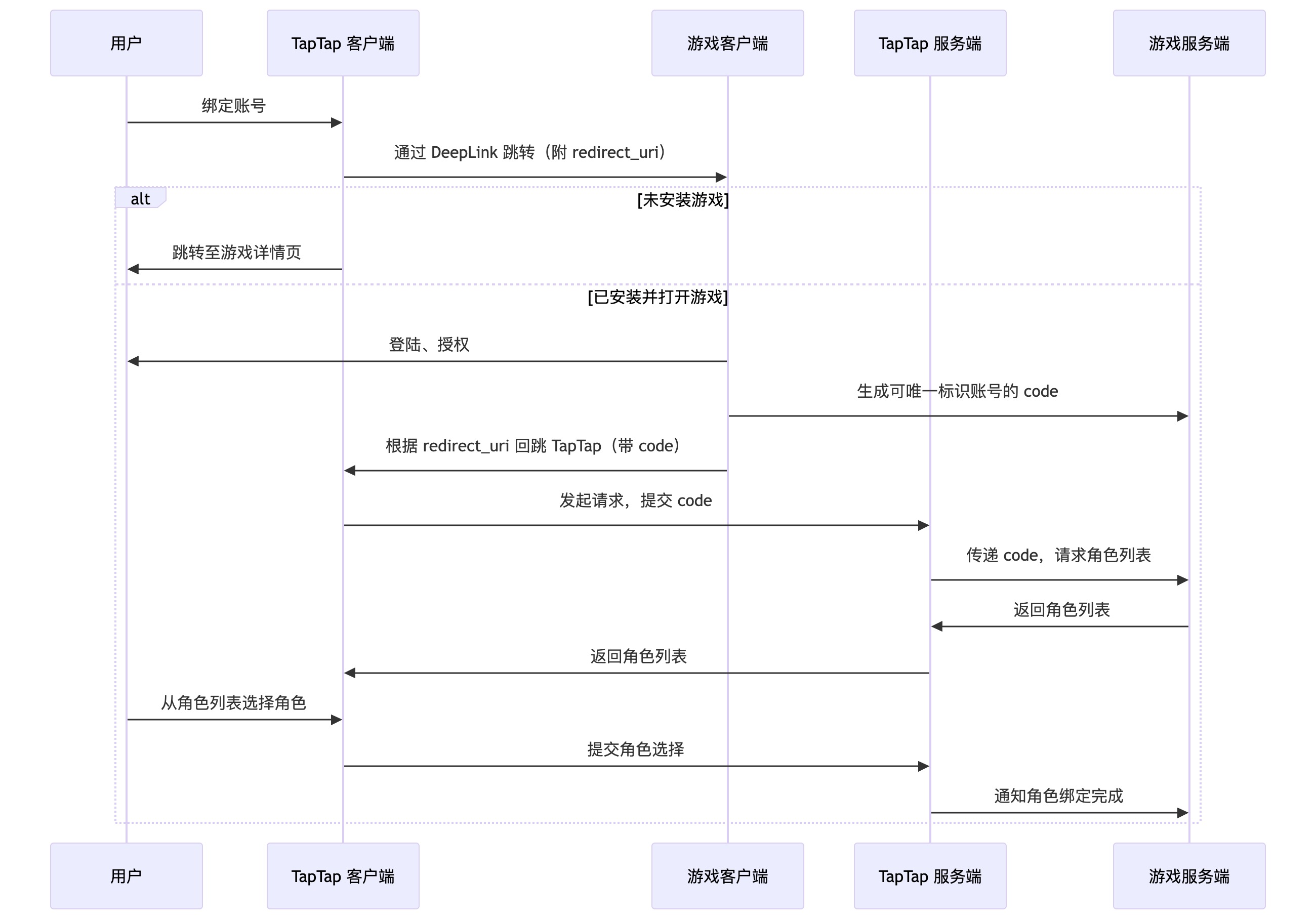 | DeepLink 跳转 | 适用场景:游戏有原生客户端,希望在游戏内完成授权 接入建议:需要客户端处理 DeepLink 并生成临时授权码(code),code 必须一次性 | 获取角色列表接口 需要客户端处理 DeepLink |