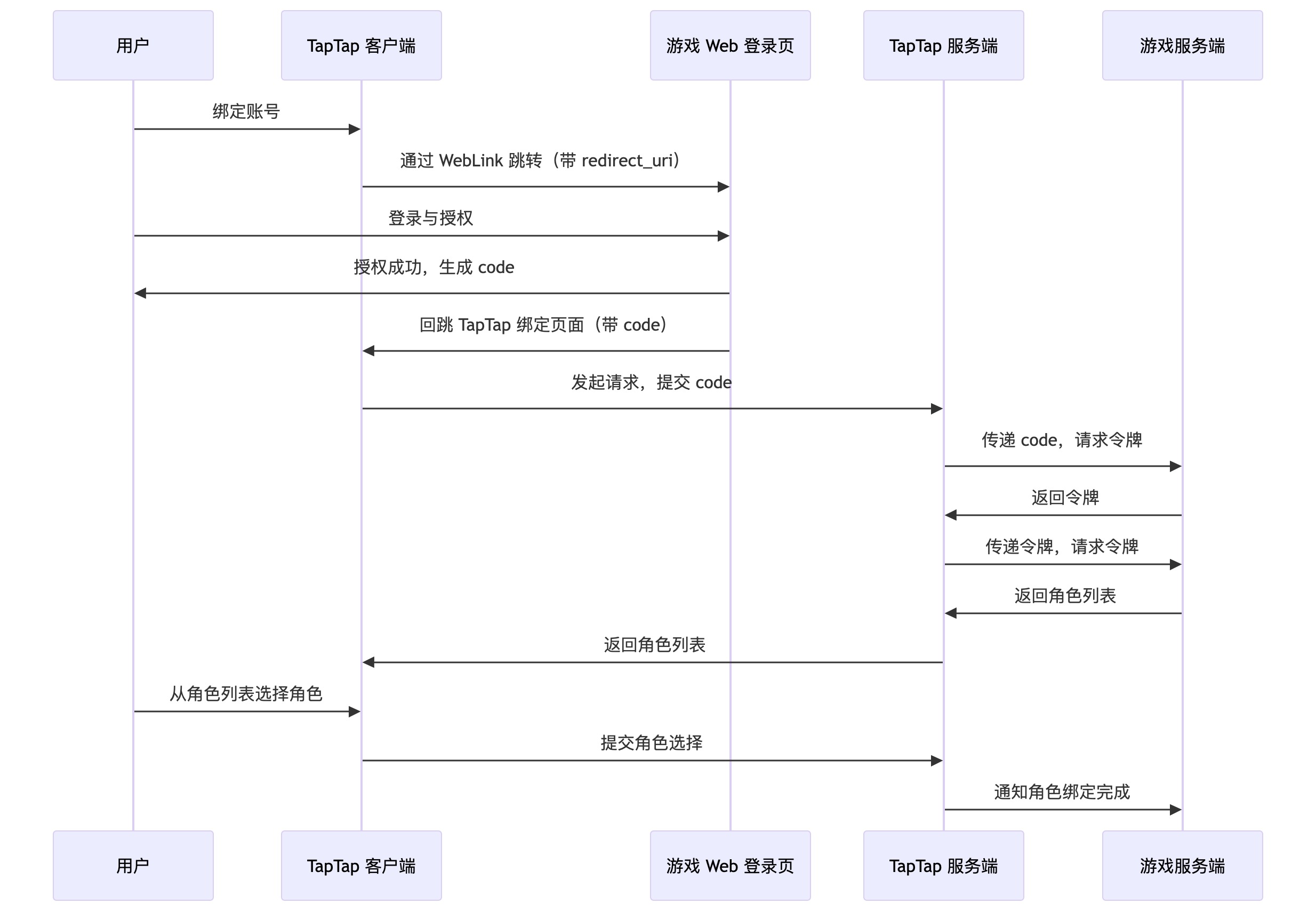 | WebLink 跳转 | 适用场景:游戏有 H5 登录页面,或需要跨平台支持(iOS/Android/Web) 接入建议:基于 OAuth2.0 流程,需开发 H5 授权页面并实现 code 换 token 机制 | 获取令牌接口 获取角色列表接口 需要开发 H5 授权页面 |