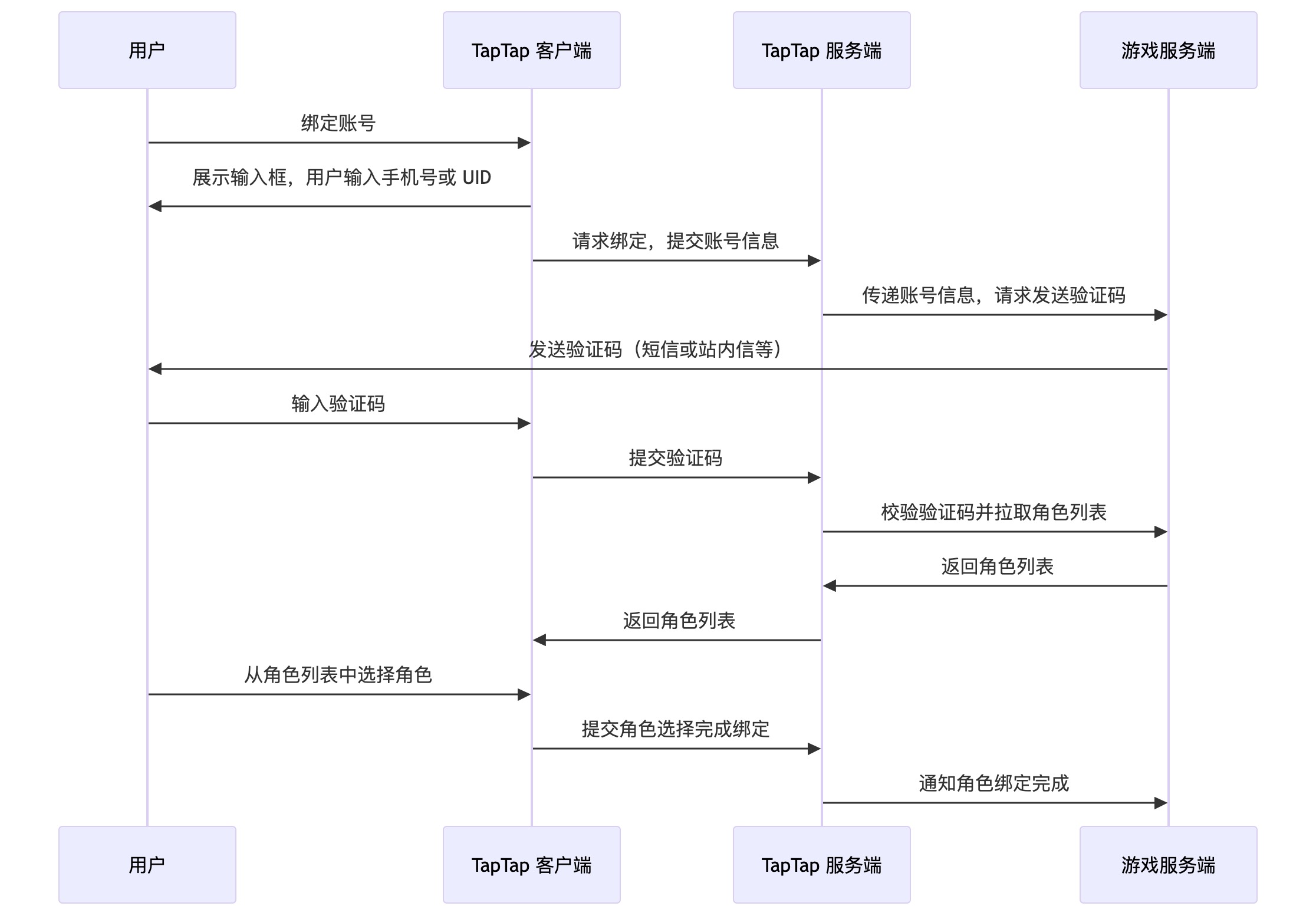 用户在 TapTap 客户端输入已知游戏账号信息(手机号/UID),通过验证码校验,最终完成角色绑定。