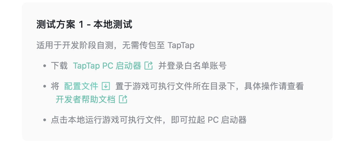 在游戏尚未发布期间,开发者可通过添加测试用户到白名单并下载 TapTap PC 端后,根据不同开发阶段选择对应测试方案进行测试。