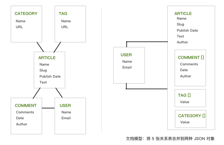 对于普通的「属性名:值」来说,设计比较简单,和 RDBMS 中平坦的表结构差 别不大。对于「一对一」或「一对多」的关系会很自然地考虑使用内嵌对象: