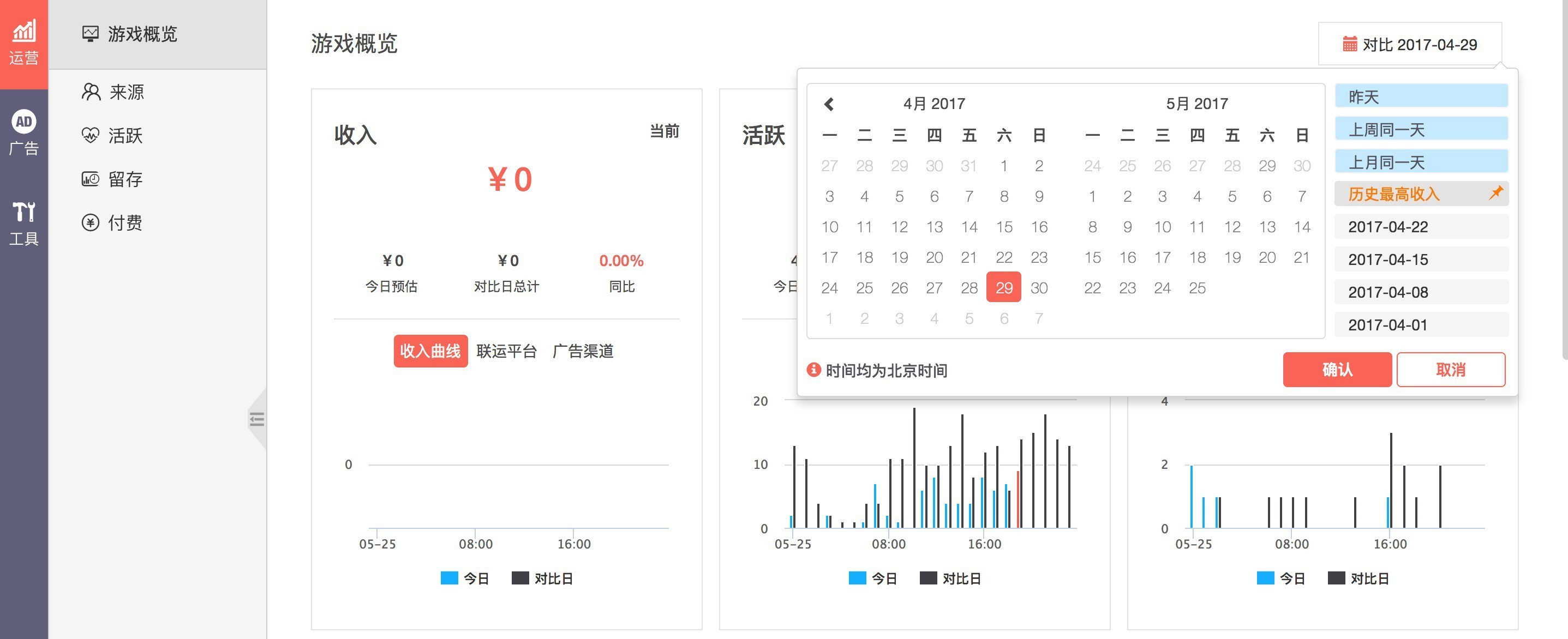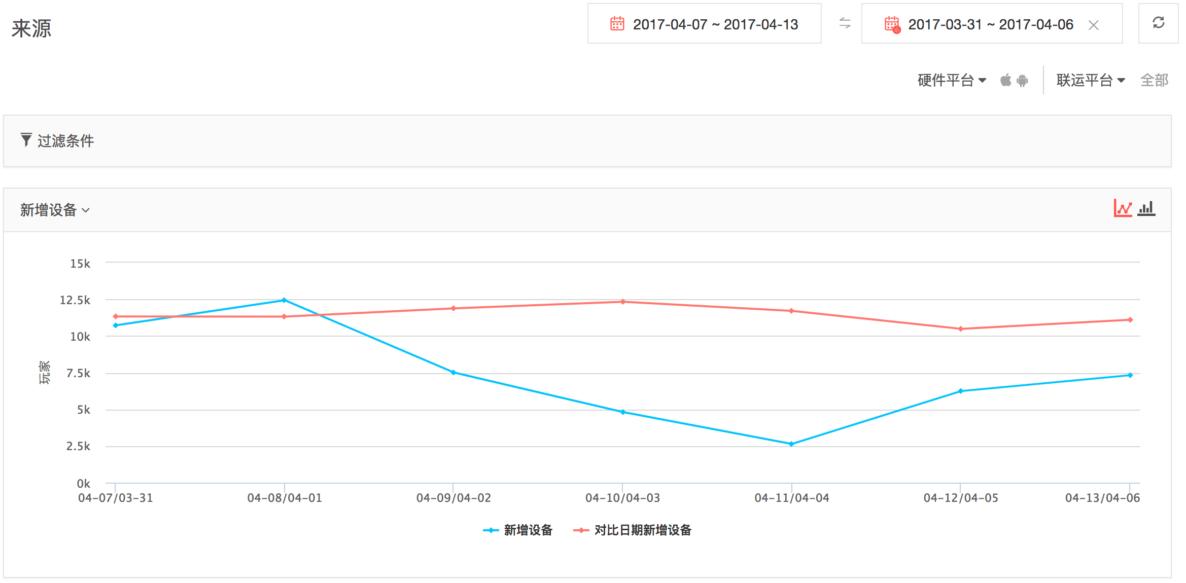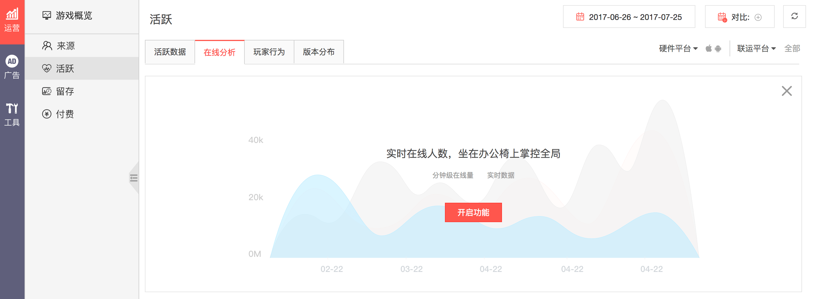 对比日期,在运营和广告模块增加对比日期功能,可以对不同时间段的数据进行对比,在图和表中均可查看对比数据的详情