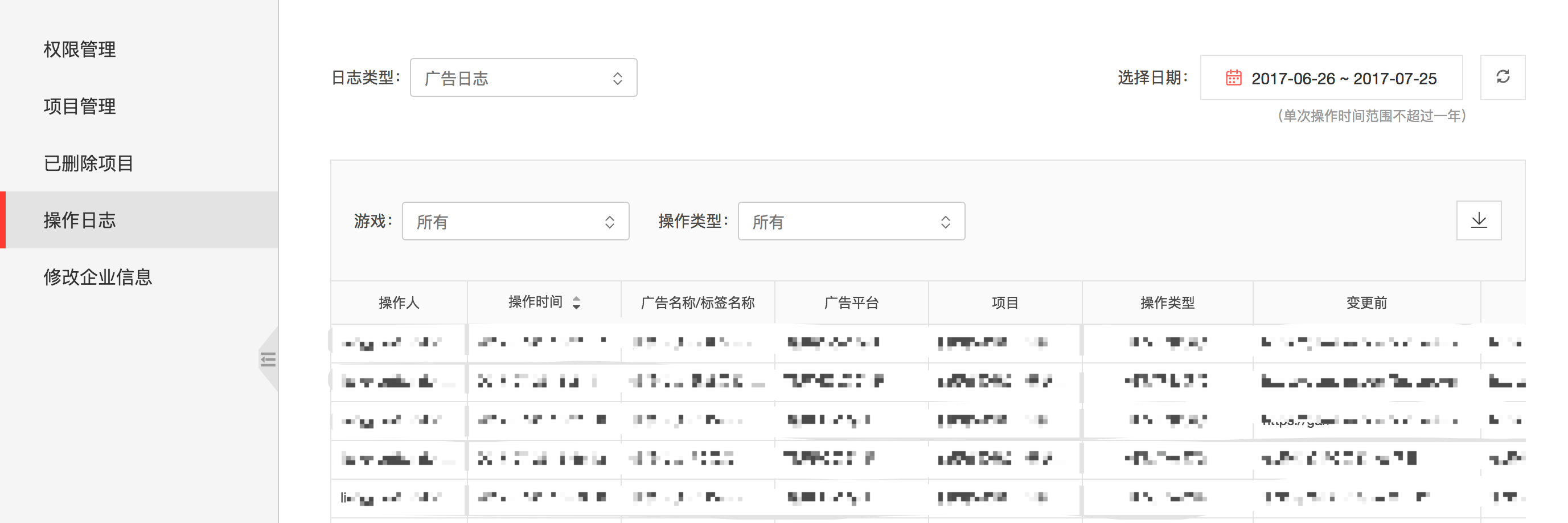 可在企业设置里查看操作日志,目前已上线项目、权限、广告三种日志类型,方便您更加快捷地了解项目状态、人员及权限变化、广告投放等情况。