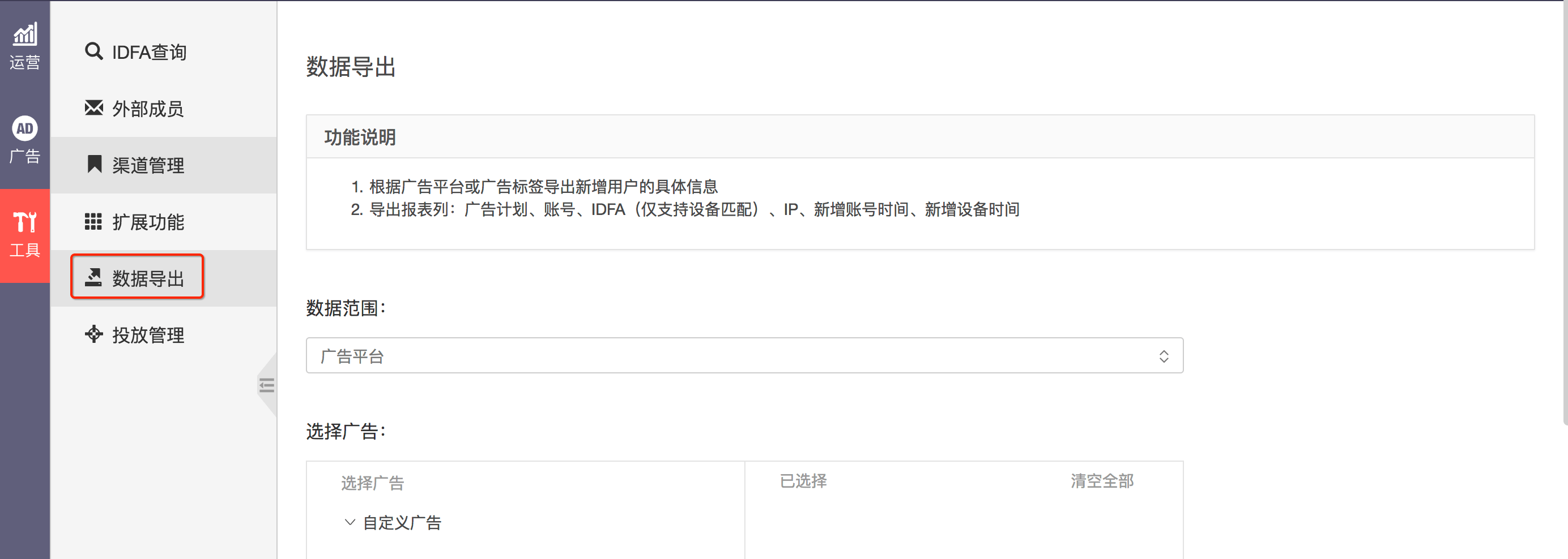 在工具中使用,可以根据广告平台或广告标签导出新增用户的具体信息,比如新增帐号,IDFA 等