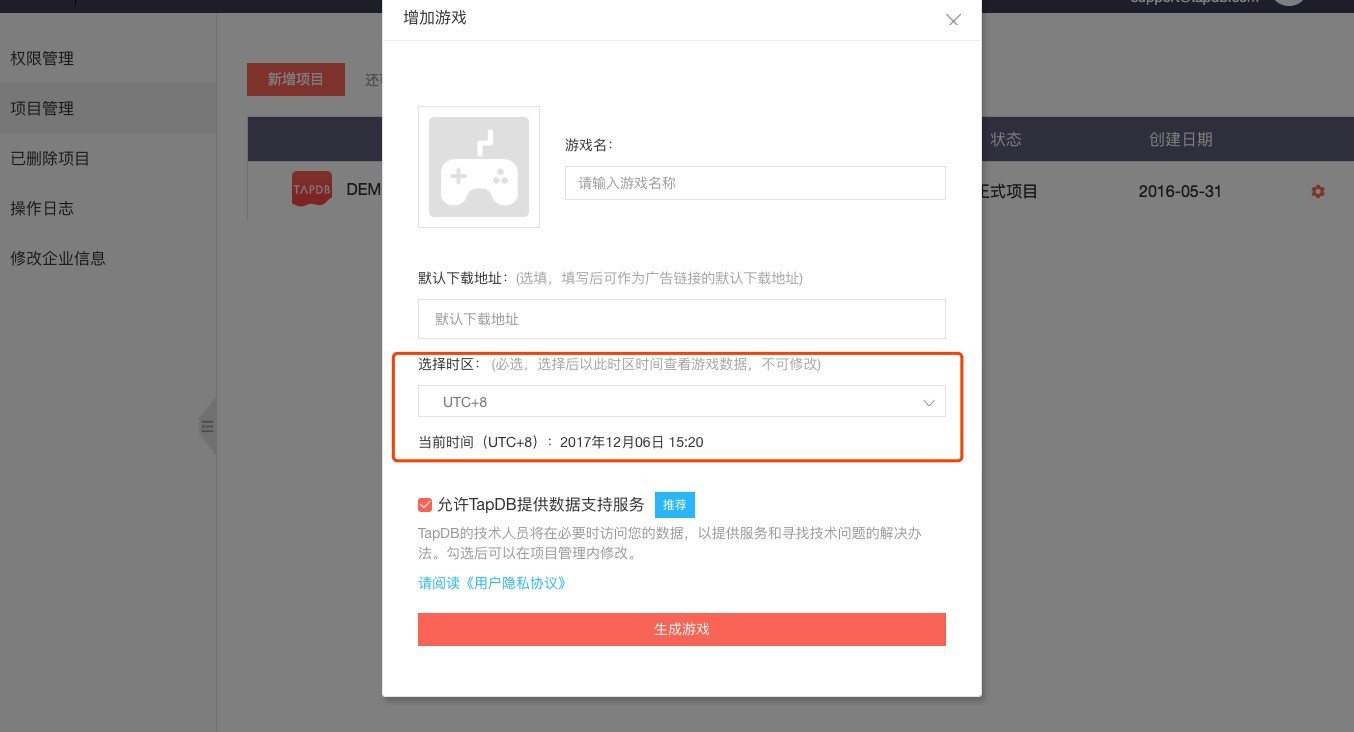 创建项目的时候可以选择不同的时区,方便不同地区发行的游戏更好的分析数据
