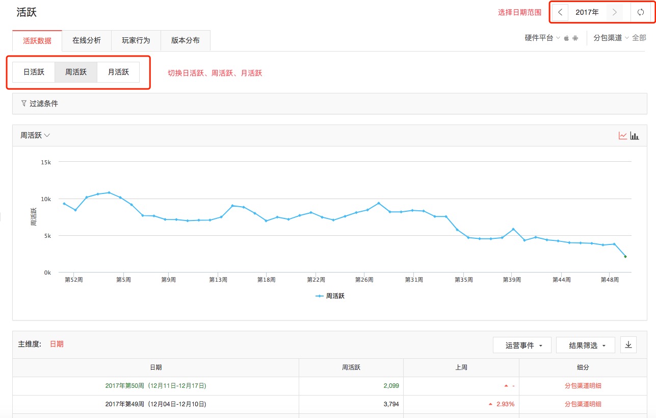其中周活跃、月活跃可以细分不同的分包渠道来查看渠道活跃明细。