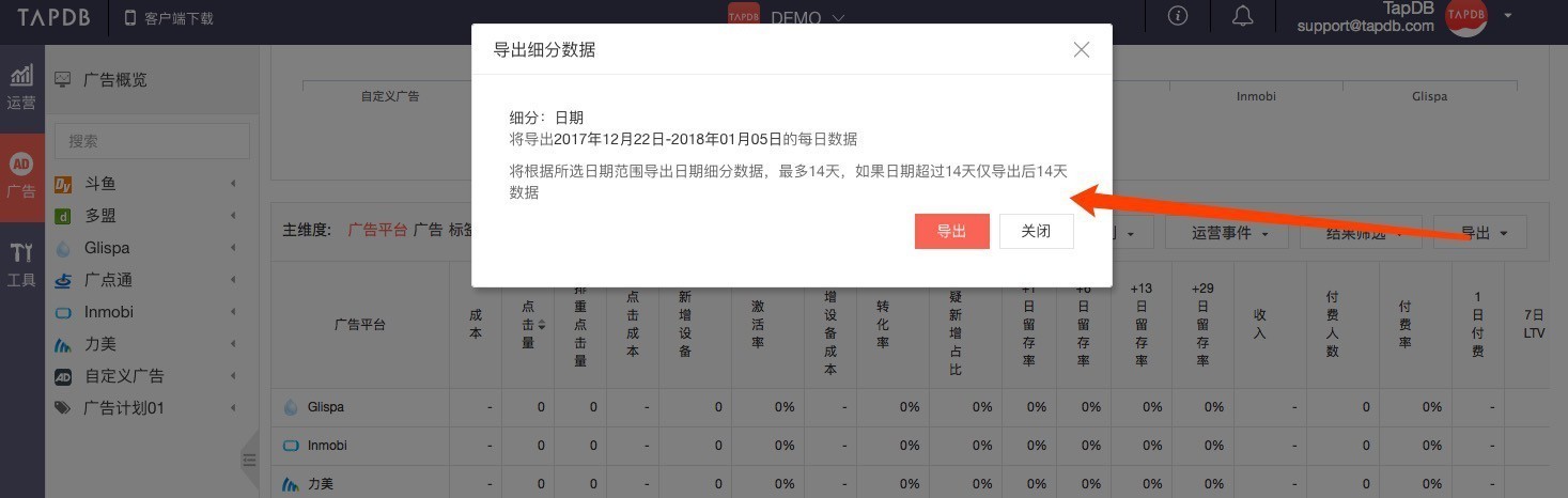 广告监测支持导出广告平台、广告、标签的细分数据,导出后方便查看每个广告下每天的数据