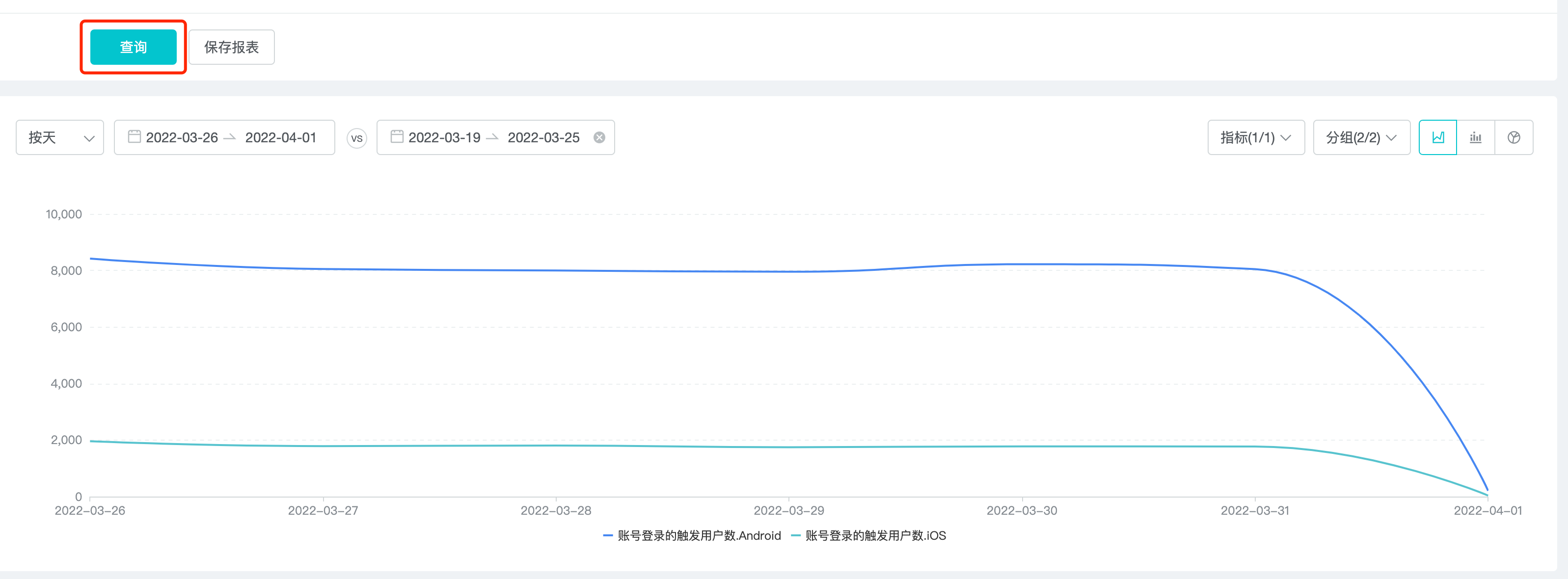 1、确定指标和筛选条件:要分析的是账号下的 DAU 和新增用户,分 iOS 和 Android 两端显示。