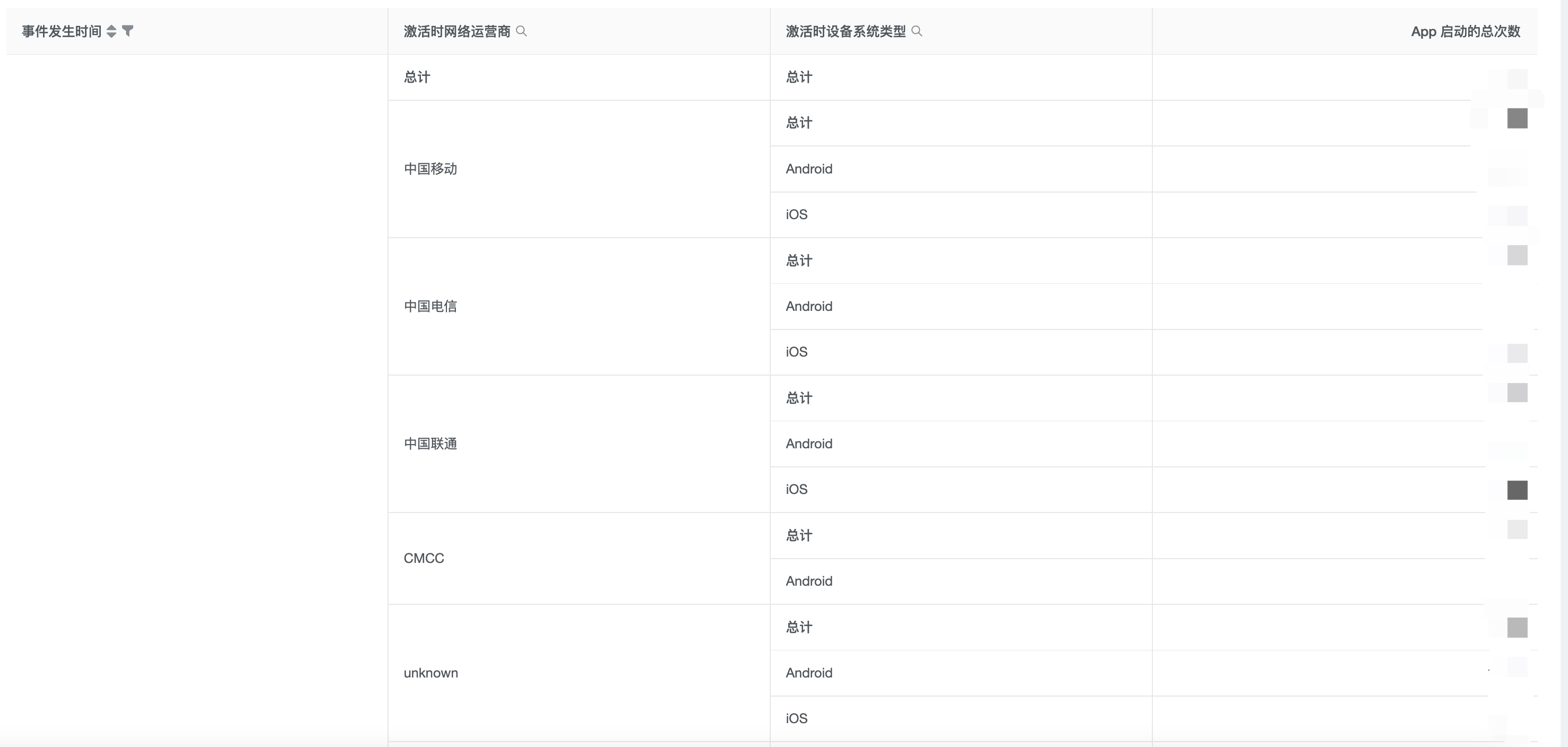5、事件细分维度下的数据:查看按钮点击事件,我按照设备类型展开,我就可以得到不同的设备触发的任意事件次数,这样我们就可以知道不同设备上的事件发生情况;