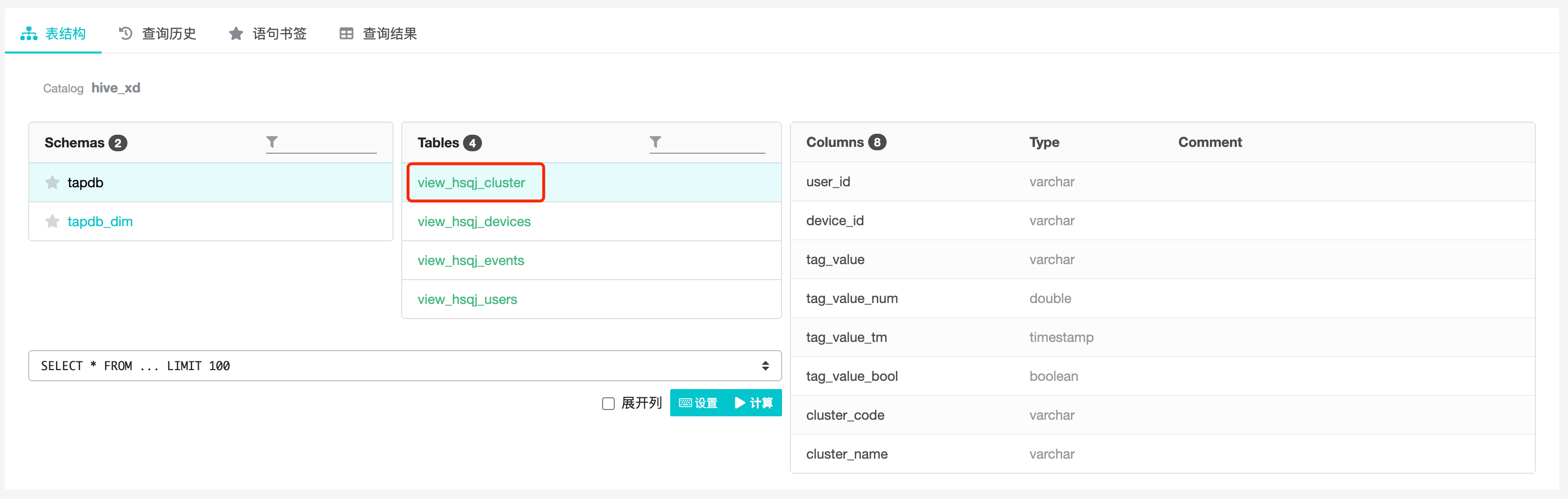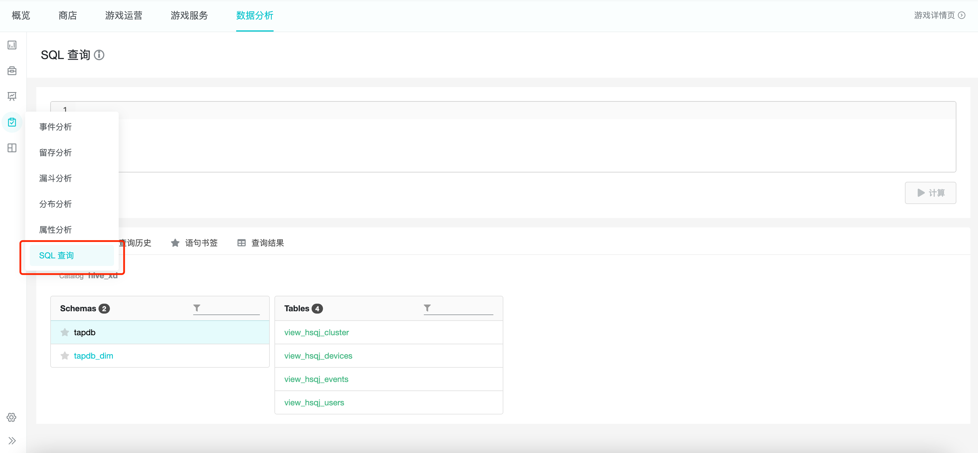 可从「分析」模块下的「SQL 查询」进入 SQL 查询功能,页面由语句「编写框」、「标签页」构成,其中标签页由「表结构」、「查询历史」、「语句书签」和「查询结果」构成。