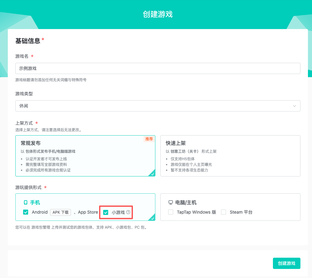 - 仅以小游戏形式发布的游戏,请在 游玩提供方式 直接选择「小游戏」。